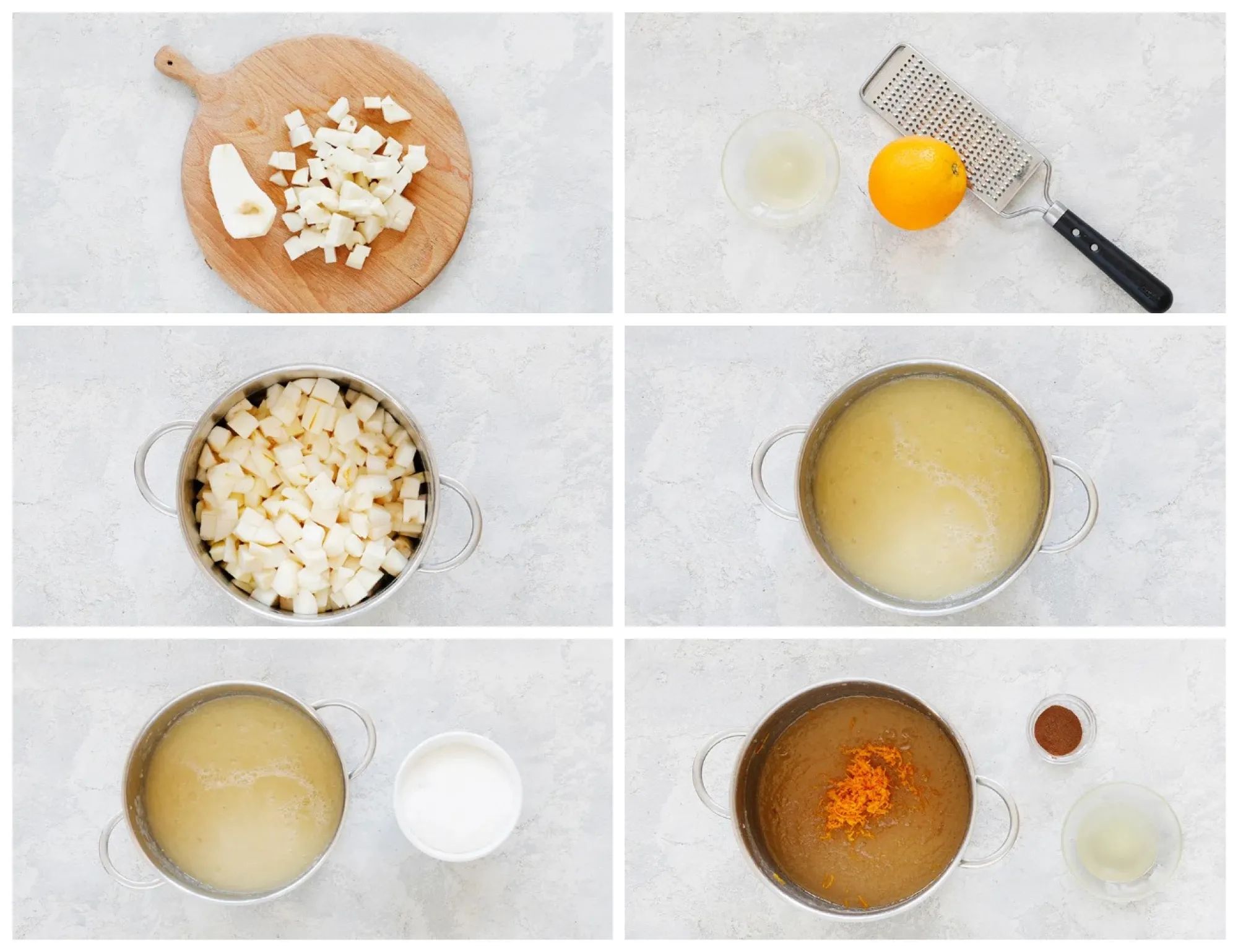 მოამზადეთ ყველა ინგრედიენტი: კარგად გარეცხეთ და გათალეთ მსხალი, მოაშორეთ გული და პატარა კუბიკებად დაჭერით. კარგად გარეცხეთ ფორთოხალი და გააშრეთ. ამის შემდეგ მოაცილეთ ცედრა და გამოწურეთ წვენი ნახევარი ლიმონისგან. დაგჭირდებათ 50 მლ.