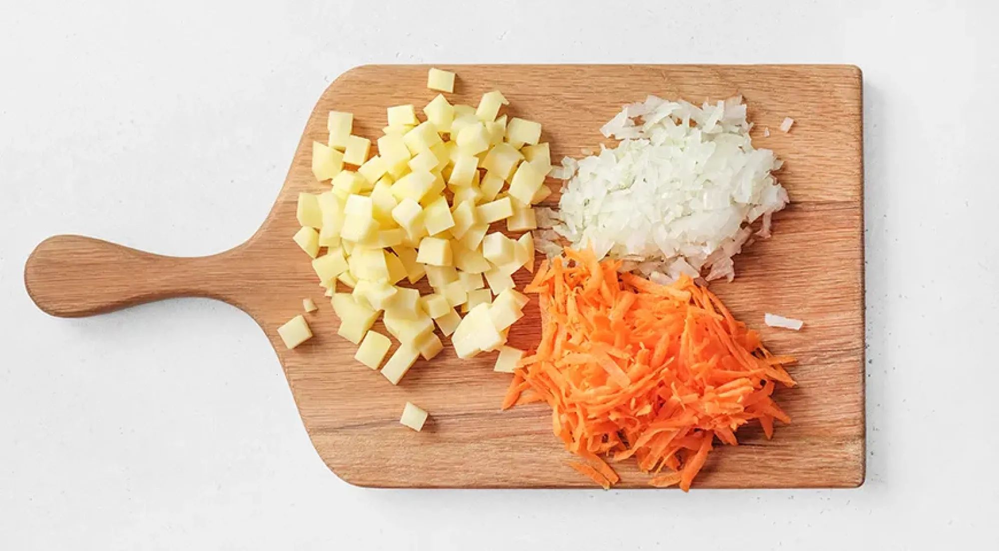 კარტოფილი კუბიკებად დაჭერით, ხახვი წვრილად დაჭერით და სტაფილო გახეხეთ.