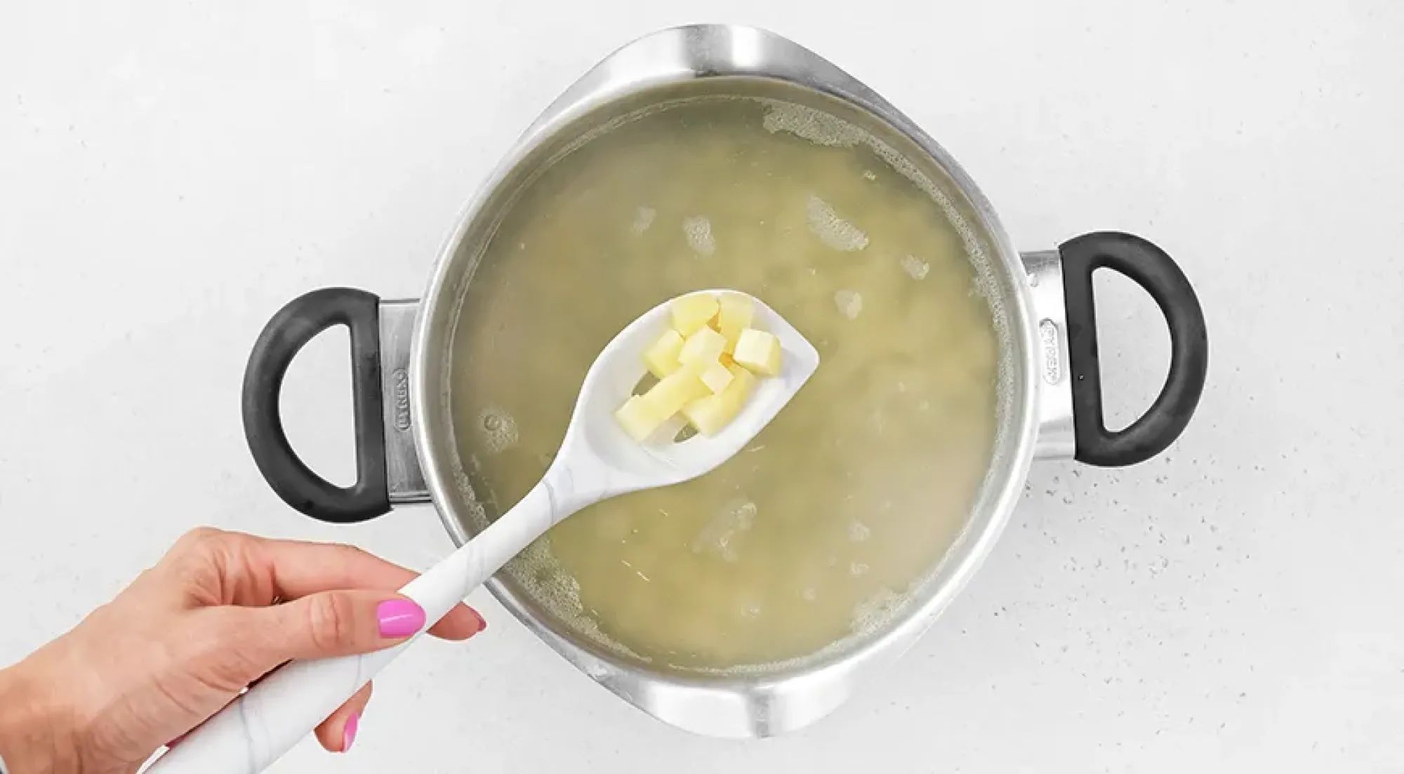 ქვაბში წყალი რომ ადუღდება, კარტოფილი ჩაყარეთ, ცეცხლს დაუწიეთ და ხარშეთ, დაახლოებით, 10 წუთი - სანახევროდ რომ მოიხარშოს.