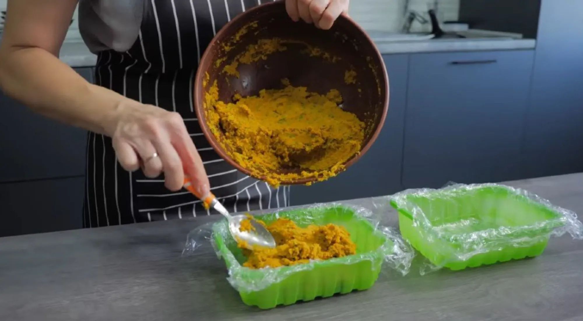 საცხობ ფორმაში დააფინეთ საცხობი ქაღალდი, ბოსტნეულის ნარევი გადაანაწილეთ და კარგად დატკეპნეთ. დააფარეთ საკვები ცელოფანი და საყინულეში 24 საათი დატოვეთ.